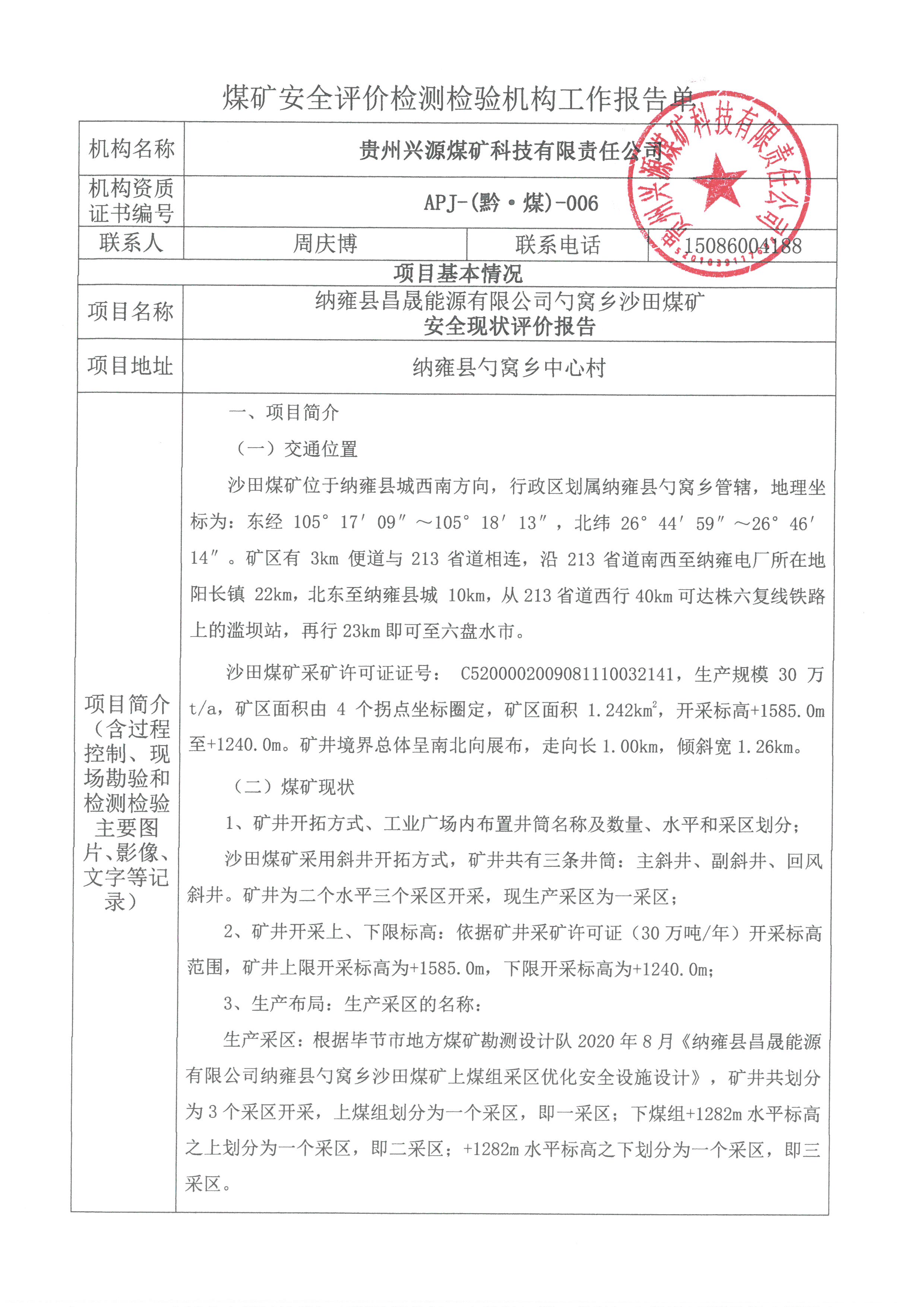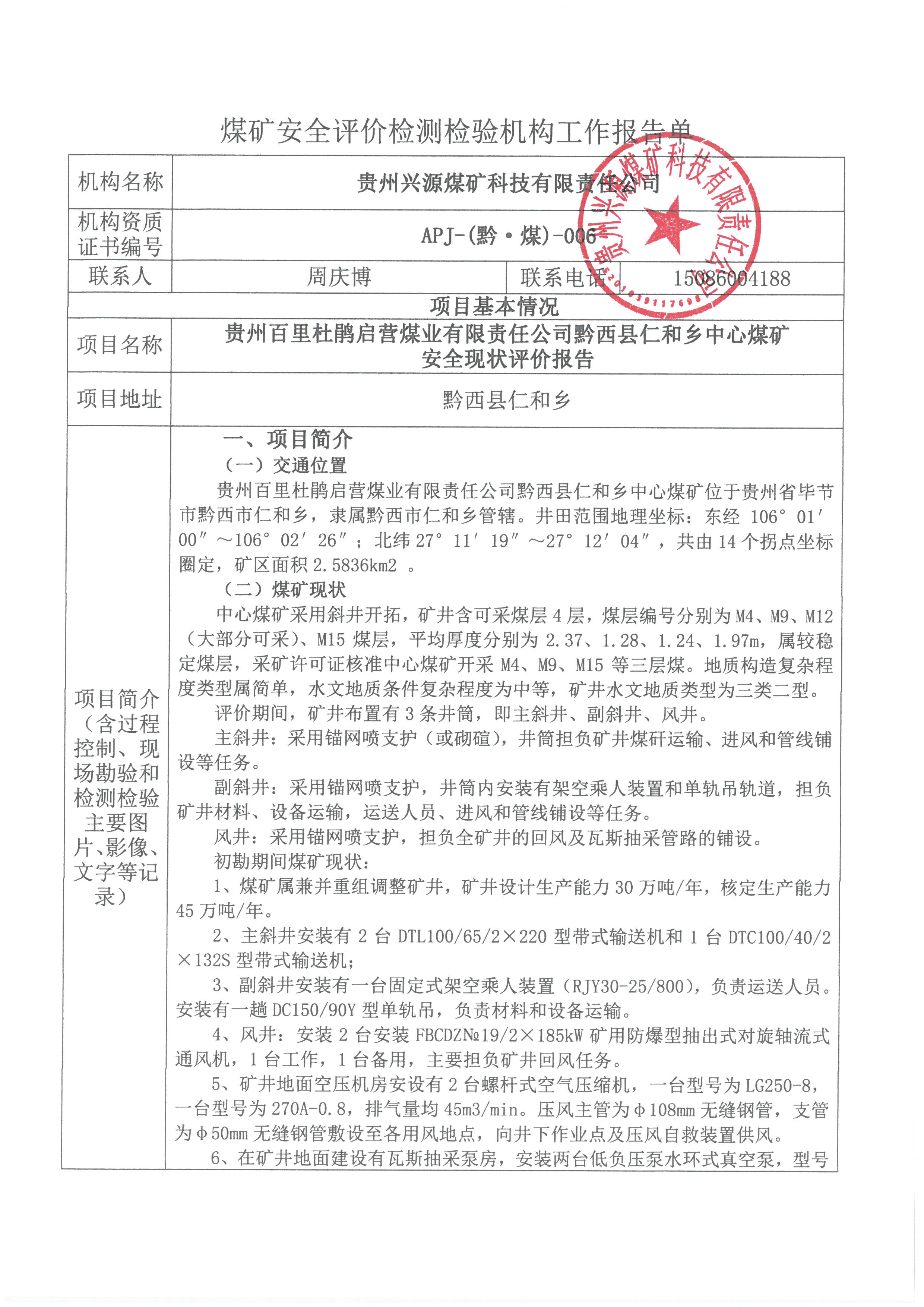 煤礦安全評價檢測檢驗機構工作報告單【貴州水城礦業股份有限公司那羅寨煤礦一二采區安全現狀評價】